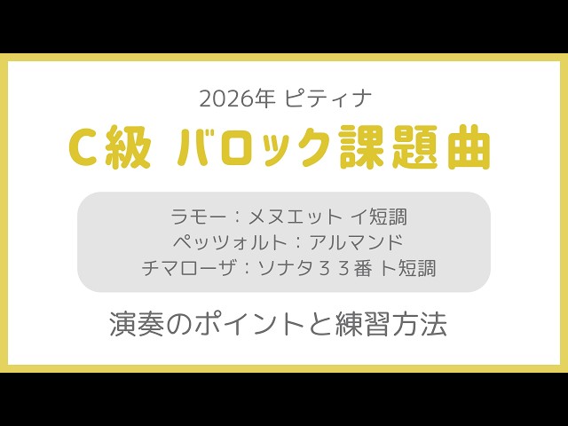 この動画講座では、2026年ピティナC級バロック課題曲の演奏のポイントと私の解釈をお伝えしています。本番に向けてお子さまがピアノの演奏をより深く理解し、演奏の完成度を高めるためのサポート教材です。 (全て上から撮影) 受講者の皆様が演奏のレベルを一段階引き上げられるよう、セクションごとに以下のポイントを丁寧に解説しております。 ・演奏のコツ ・注意点 ・おすすめの練習方法 ・講師の個人的な解釈 譜読み段階の方から仕上げを目指す方まで、幅広くご活用いただけます。解釈につきましては、私自身のものとなりますので、役立つ部分を自由に取り入れて頂ければと思います。 なお、講座ご購入後60日間は、いつでもLINEで質問可能なサポート体制を整えておりますので、 演奏の疑問やお悩みを即座に解消でき、安心して練習に取り組んでいただけます。日々の練習を長期間バックアップいたします。 講座の内容についてご不明点がございましたら、お気軽にメッセージをお送りください。 公式LINE: https://lin.ee/c7N7RRn 3曲の通し演奏は下をご視聴ください↓(講座内にもございます。)